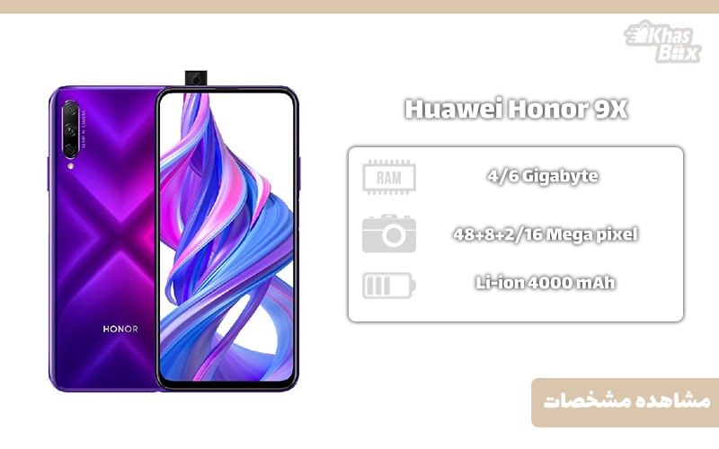 قاب پشتی دستگاه میزبان دوربین 3 گانه این گوشی است و از طراحی و  جلوه های نوری زیبایی برخوردار است. دوربین اصلی در هواوی Honor 9X یک لنز 48 مگاپیکسلی است و به کمک دو دوربین دیگر قادر به ثبت تصاویر بسیار با کیفیتی برای شما می باشد. دوربین دوم که رزولیشن 8 مگاپیکسلی دارد برای عکس برداری فوق عریض در نظر گرفته شده است و دوربین سوم نیز یک لنز 2 مگاپیکسلی تشخیص عمق می باشد. برای علاقه مندان به عکاسی سلفی نیز هواوی یک دوربین 16 مگاپیکسلی را در نظر گرفته است که مکانیزم پاپ آپ دارد و با سویچ کردن دوربین اصلی بر روی آن شاهد بیرون آمدن این دوربین از جلوی گوشی خواهید بود.