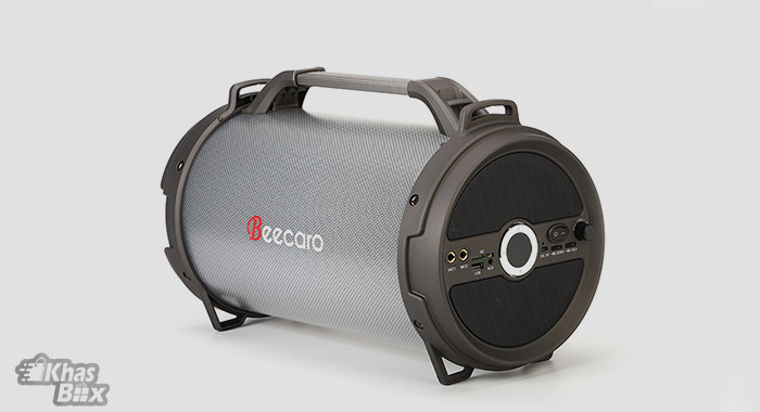 همانطور که گفتیم از نظر ظاهری با محصولات خاصی رو به رو هستیم که طراحی نسبتا جذابی هم دارند. با دیدن این اسپیکر به خوبی متوجه حرفهای بودن آن خواهید شد. به ویژه وقتی که دارای جلوههای نوری نیز میباشد. این اسپیکر که به صورت استوانهای است، در بالای خود یک دسته نگه دارنده بزرگ به طول خود اسپیکر دارد. لوگوی Beecaro در وسط اسپیکر درج شده است. اگر اسپیکر را به صورت عمودی قرار دهیم در قسمت پایینی استوانه درگاههای بسیار زیادی را از جمله دو درگاه میکروفون، درگاه Aux، درگاه USB و غیره را میبینیم که نشان از تنوع این اسپیکر در زمینه اتصالات دارد.