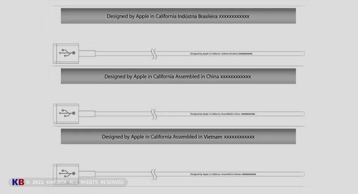 بعد از جعبه یکی از راه‌های ساده برای تشخیص شارژر اصلی اپل از نمونه فیک توجه به نوشته‌های درج شده بر روی کابل لایتنینگ است. بر روی کابل لایتنینگ اصلی یک نوشته و به دنبال آن شماره سریال 12 رقمی را پیدا می‌کنید. این متن به صورت Designed by Apple in California و به دنبال آن Assembled in China ، Assembled in Vietnam و یا Indústria Brasileira درج شده است.