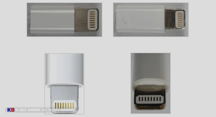 پس از چک کردن این مرحله، نوبت به اتصال کابل لایتنینگ می‌رسد. خود اپل در صفحه پشتیبانی سایت رسمی خود راه‌های بسیار خوبی را برای تشخیص این قسمت معرفی کرده است. به عنوان مثال انتهای کابل شارژ اپل و درست در قسمت اتصال لایتنینگ شما کانکتورهای طلایی یا نقره‌ای رنگ که به صورت منحنی و گرد طراحی شده‌اند را می‌بینید. اما در نمونه تقلبی این کانکتورها با گوشه‌های تیز و خشن طراحی شده اند. علاوه بر این رنگ درگاه لایتنینگ به تنهایی گویای همه چیز است. در نمونه اصلی اتصال لایتنینگ رنگ شفاف و نقره‌ای دارد در حالیکه نمونه تقلبی تیره تر می‌باشد.