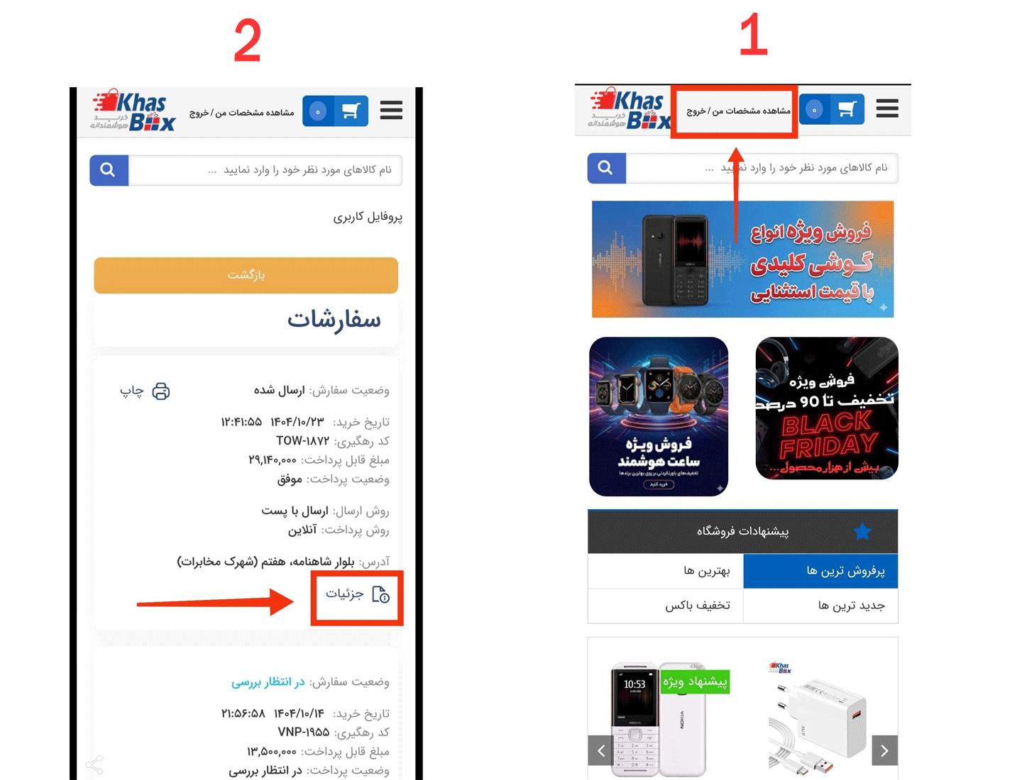 سپس از قسمت پروفایل بر روی سفارشات کلیک کرده، سفارش مورد نظر خود را پیدا کرده و بر روی جزئیات کلیک کنید.
