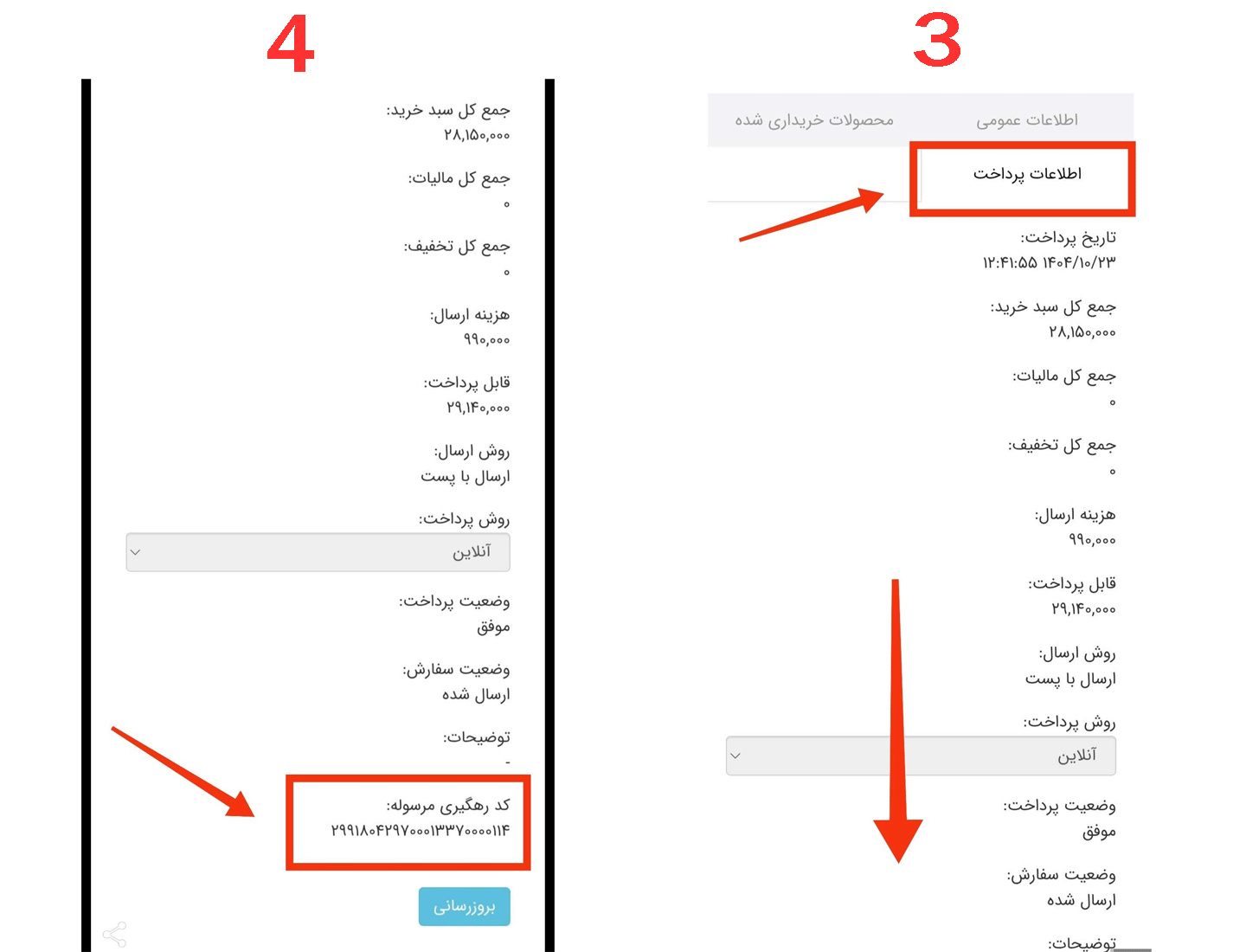در صفحه جدید باز شده، به تب سوم یعنی اطلاعات پرداخت رفته و در پایین صفحه کد رهگیری مرسوله نمایش داده می شود.