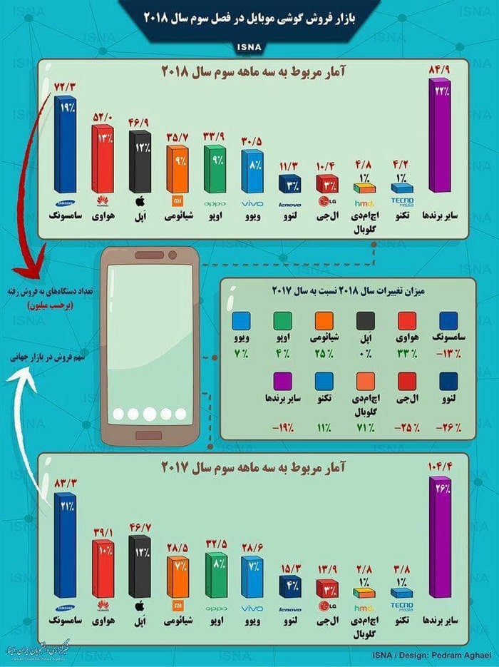 در آخر از شما عزیزان دعوت می کنم نیم نگاهی به جدول فروش برند های تلفن همراه در سال 2018 و مقایسه آن با مدت مشابه در سال قبل داشته باشید که به صورت چند نمودار با پارامتراهای متفاوت ترسیم شده است.این اینفوگرافیک از سایت ایسنا گرفته شده است.