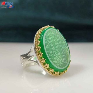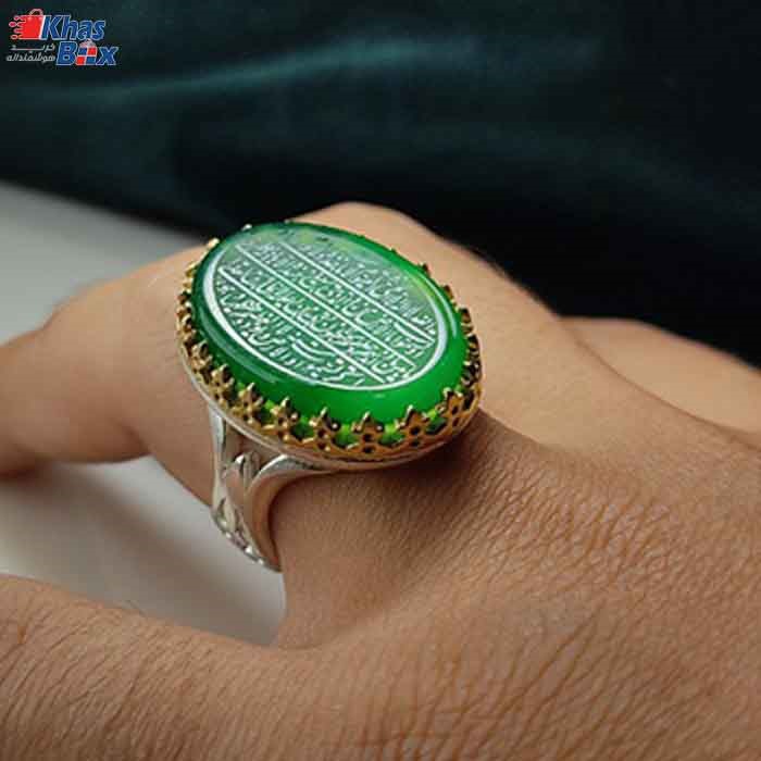 انگشتر مردانه عقیق سبز 1595 یک انگشتر فاخر و نفیس از جنس سنگ عقیق میباشد که این نگین زیبا بر روی رکابی از نقره با بالاترین عیار ممکن جا خوش کرده است. قطعا شما هم میدانید زیبایی انگشتر روی دست دو چندان میشود. این محصول که با آیات قرآنی بر روی سنگ تزئین شده، اثری زیبا و ماندگار برای استفاده شخصی یا مناسب هدیه به عزیزانتان می باشد. اگر قصد خرید انگشتر مردانه عقیق سبز 1595 را دارید بهتر است بدانید این انگشتر دست ساز بوده و دارای رکابی با طرح ترک است. قیمت انگشتر مردانه عقیق سبز 1595 در این صفحه بروز و معتبر است و نیازی به استعلام تلفنی نیست ولی ما در تمام ساعات شبانه روز آماده پاسخگویی به سوالات شما و مشاوره در رابطه با خرید انگشتر هستیم. مشخصات دقیق این انگشتر از قبیل وزن و قطر نگین و ... در قسمت زیر نوشته شده است همچنین برای تعیین سایز انگشتر میتوانید به این لینک مراجعه کرده یا با پشتیبانی واتس آپ ارتباط برقرار نمایید. در صورتیکه تمایل دارید مستقیما و بدون مشاوره انگشتر مورد نظر را خریداری کنید به یاد داشته باشید حتما در قسمت آدرس سایز انگشتر یا اندازه دور انگشت را به میلی متر ذکر کنید.