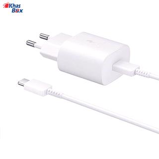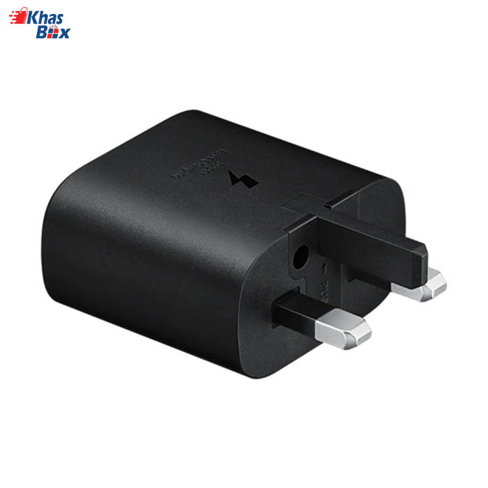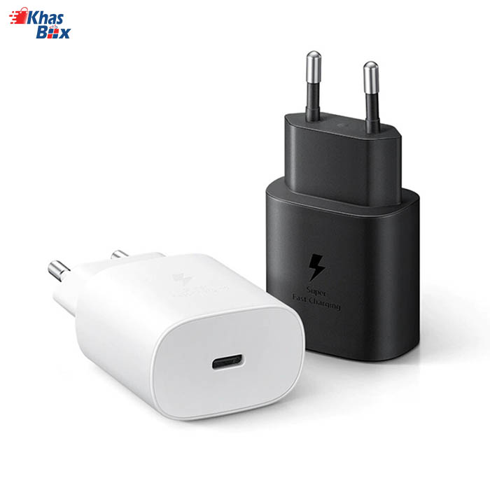 شارژر اورجینال گلکسی 25 وات از یک آداپتور 25 وات و یک کابل تبدیل USB تایپ C تشکیل شده است. این شارژر دیواری دارای نسخههای متفاوتی با توجه به پارت نامبر یا همان سفارش کشورهای مصرف کننده میباشد به همین علت این شارژر در بعضی مدلها به صورت دوشاخه طراحی شده و در بعضی دیگر سه شاخه که نیاز به مبدل دوشاخه است تا بتوانید آن را به پریز برق متصل نمایید. اگر نیاز به مبدل دارید اینجا انواع مبدل وجود دارد.