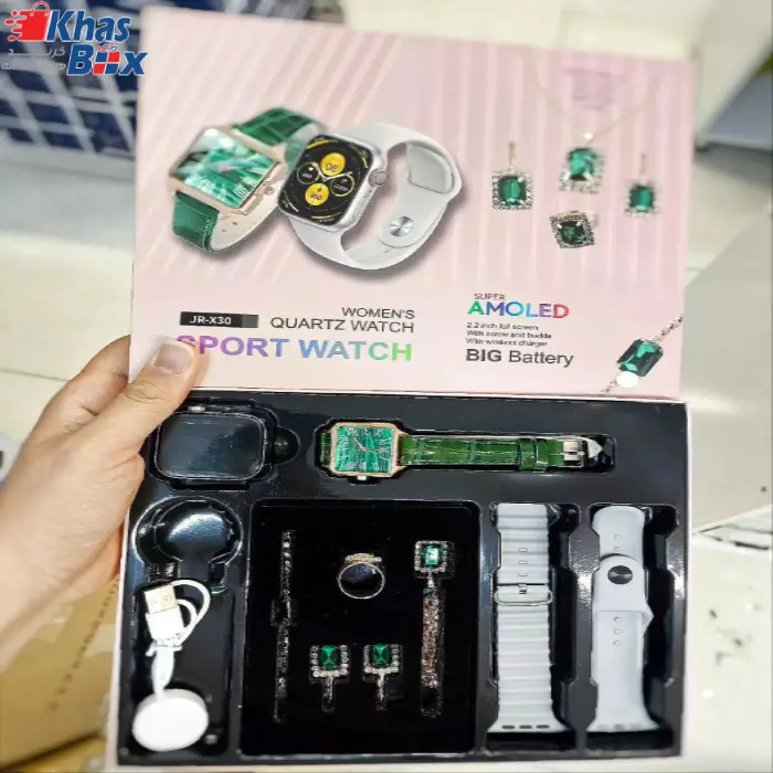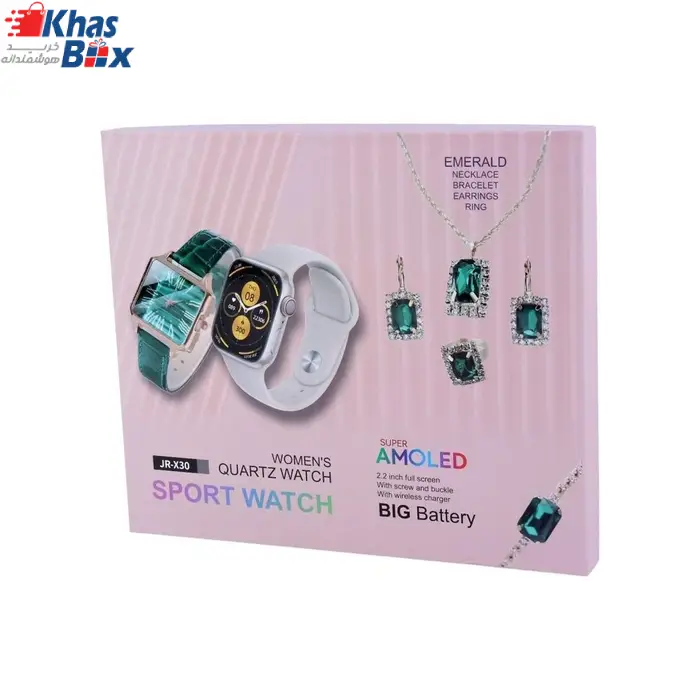 ویژگی ها: دارای 2بند دارای ساعت زنانه دارای گردنبند و گوشواره و حلقه و دستبند پشتیبانی ازاعلانات فارسی و منوی فارسی سنسورهای سلامتی فشارخون،ضربان قلب،گام شمار،اکسیژن خون شارژ وایرلس