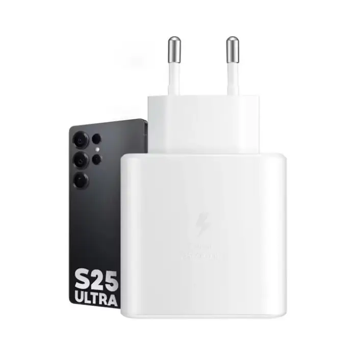 شارژر 45 واتی S25 Ultra سامسونگ یک آداپتور برق قدرتمند با توان 45 وات و ولتاژ ورودی 100-240V میباشد، که میتواند به سرعت گوشی S25 Ultra و طیف وسیعی از دستگاههایی که از شارژر 45 واتی پیشتیبانی میکنند را شارژ کند. این آداپتور دارای فناوری Super Fast Charging 2.0 و Power Delivery 3.0 است و هنگام اتصال، علامت شارژ به رنگ آبی و عبارت Super Fast Charging 2.0 روی صفحه نمایش ظاهر میشود.