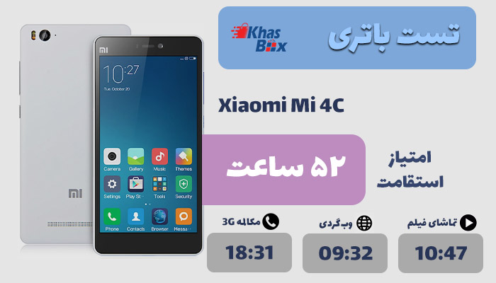در بخش مکالمه باتری اصلی گوشی شیائومی Mi 4C به اندازه 18 ساعت و 31 دقیقه دوام میآورد. در بخش وب گردی و مرور شبکه های اجتماعی این مدت زمان به 9 ساعت و نیم میرسد و در تماشای فیلم نیز این باتری به اندازه 10 ساعت و 47 دقیقه دوام میآورد. تمامی این نتایج به همراه بازدهی آماده به کار گوشی، امتیاز 52 ساعته را برای شیائومی Mi 4C رقم زده اند.