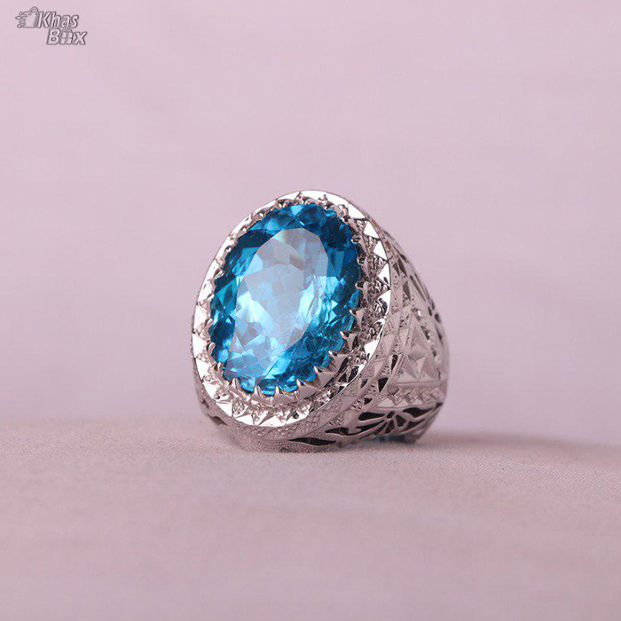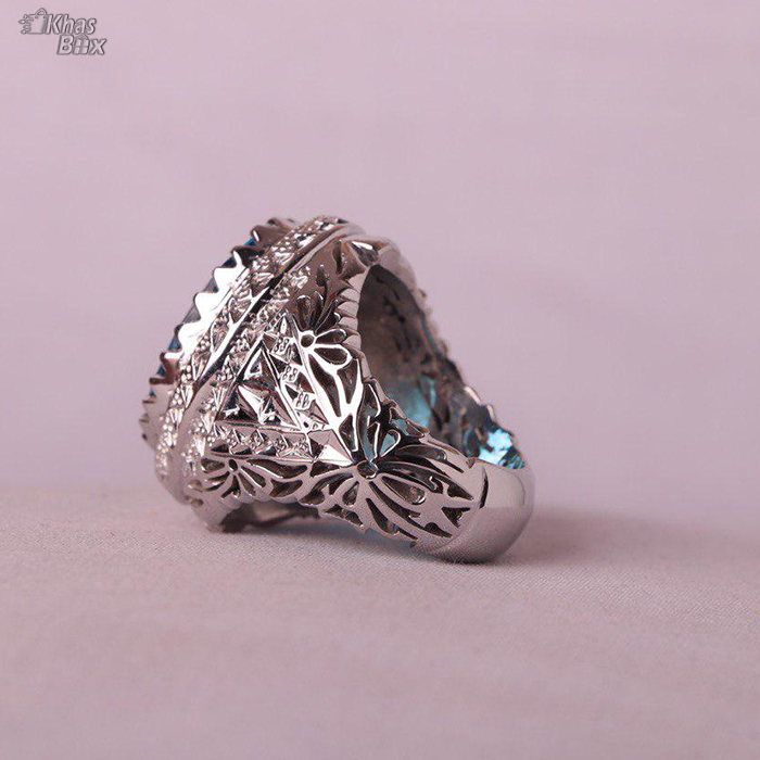 انگشتر توپاز سوئیس اصل نگین درشت و خوشرنگ رکابی نفیس و فاخر روکش طرح پلاتین اینه کاری و شبکه کاری شیک و دقیق اثری زیبا با امضا استاد گلستان وزن ۳۶.۸ گرم