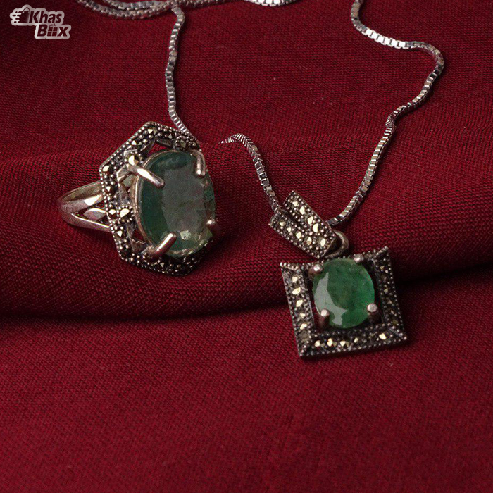 ست زمرد زامبیا اصل نقره سیاه قلم کار شده با نگین سوپر مارکازیت فوق العاده شیک و زیبا همراه با شناسنامه معتبر توسط گوهر شناسی GIAL وزن ۷.۲۹ گرم