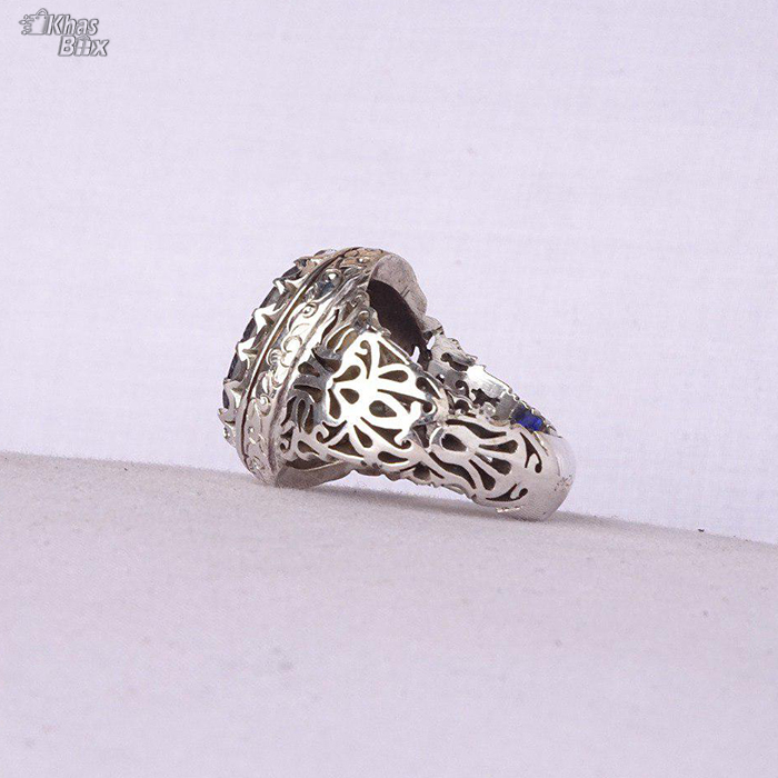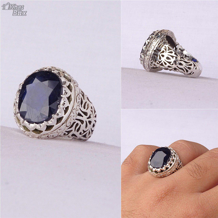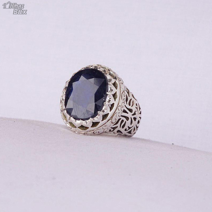 انگشتر یاقوت کبود آفریقایی اصل رکابی نفیس و ارزشمند قلم زنی شده شبکه کاری ریز و دقیق اثری زیبا با امضا استاد محمدپور وزن ۲۰.۵۴ گرم