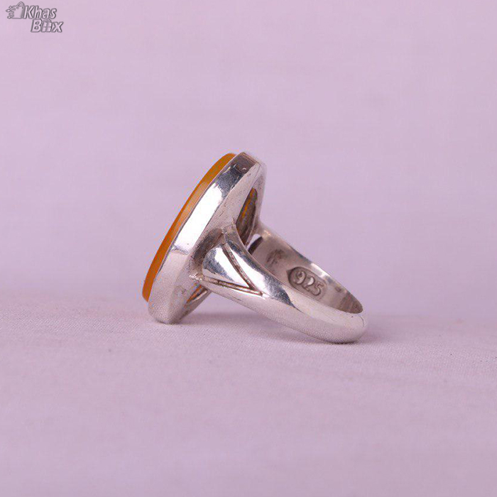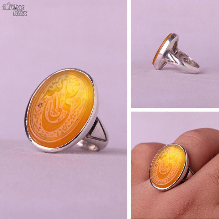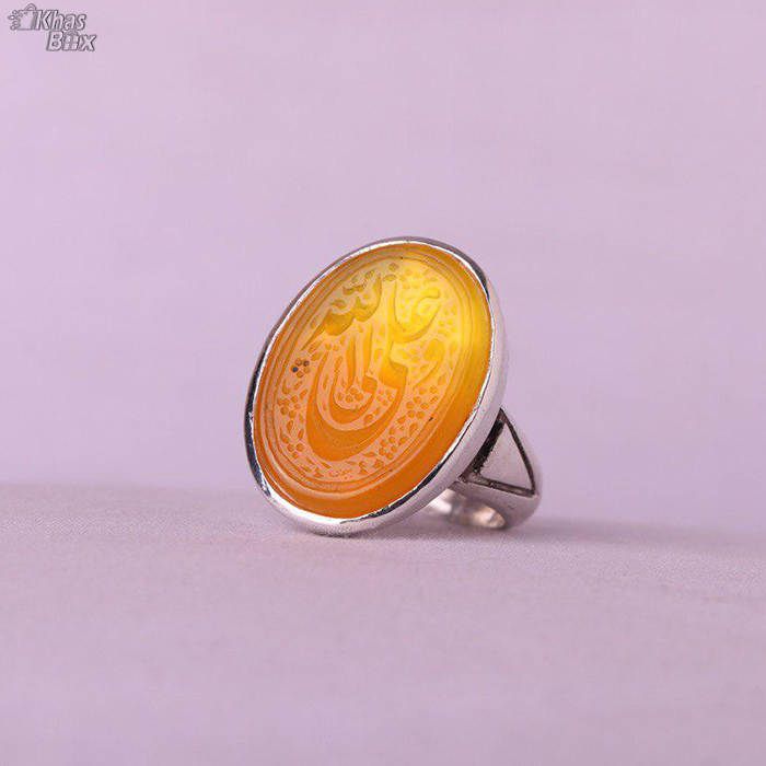عقیق پرتقالی خطی نقش علی ولی الله اثری زیبا با امضا استاد بحجت رکاب نقره پااردکی عیار ۹۲۵ ۱۳.۶۷ گرم
