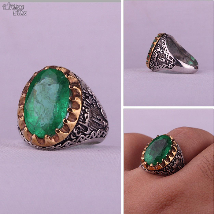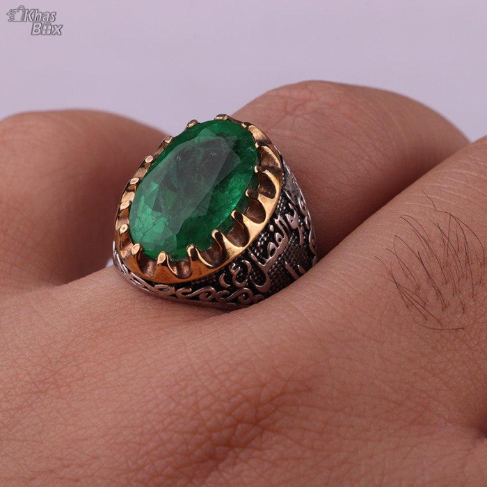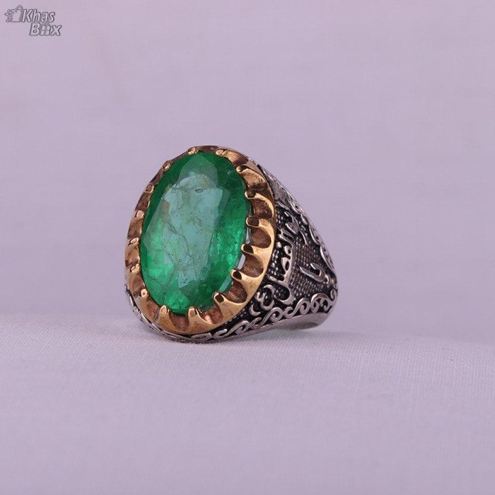 زمرد برزیلی رکاب طرح قلم زنی تاج برنجی نقش یا ابوالفضل ع عیار ۹۲۵ ۱۳.۱۲ گرم