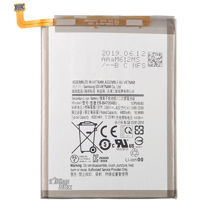 باتری سامسونگ A70 دارای ظرفیت بسیار خوب 4500 میلی آمپر است که وظیفه تامین نیرو در این میان رده پرفروش را بر عهده دارد. این باتری از نوع لیتیوم پلیمری بوده و قابلیت تعویض آسان توسط کاربران عادی را ندارد. چنانچه شما قصد خرید باتری سامسونگ A70 و تعویض آن با باتری اصلی را دارید، حتماً این کار را به کمک تعمیرکار مجاز انجام دهید تا از مشکلات احتمالی و بروز آن جلوگیری شود.