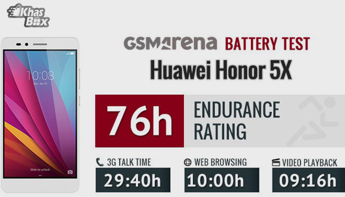باتری اصلی Honor 5x با امتیاز 76 ساعت به راحتی رقبای خود را کنار می گذارد و می توان این عملکرد خوب را نتیجه بروزرسانی EMUI و بهینه سازی خارق العاده آن دانست. در تست تماس 3G باتری آنر 5x توانست به اندازه 29 ساعت و 40 دقیقه گوشی ما را روشن نگه دارد. در آزمون وب گردی نیز این گوشی می تواند به اندازه 10 ساعت برای شما کار کرده و صفحه نمایش شما را روشن نگه دارد. تست آخر نیز مربوط به تماشای فیلم می شود که مدت زمان کسب شده توسط این باتری به اندازه 9 ساعت و 16 دقیقه می باشد. کشش کلی و حالت آماده به کار که مدت زمان 76 ساعت را برای ما کسب کرد، مربوط به کارکرد عادی و روزمره ی شما اعم از یک ساعت تماس، یک ساعت وبگردی و یک ساعت تماشای فیلم می شود و در صورت استفاده ی سنگین تر مانند بازی کردن این مدت زمان کاهش می یابد.