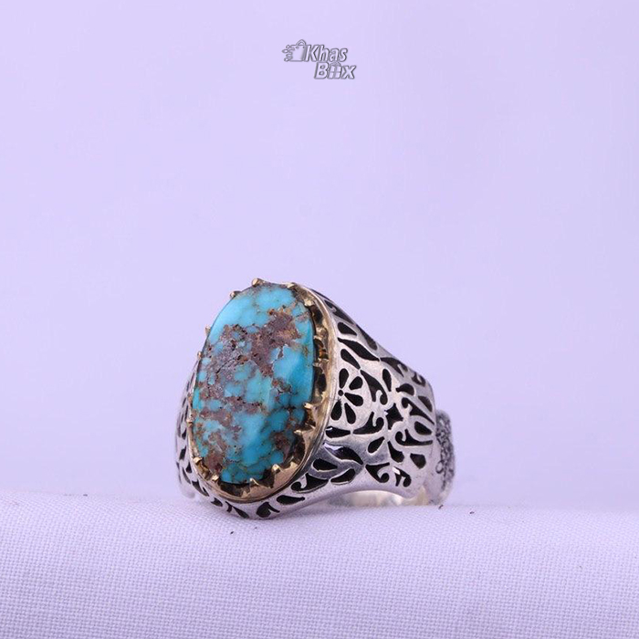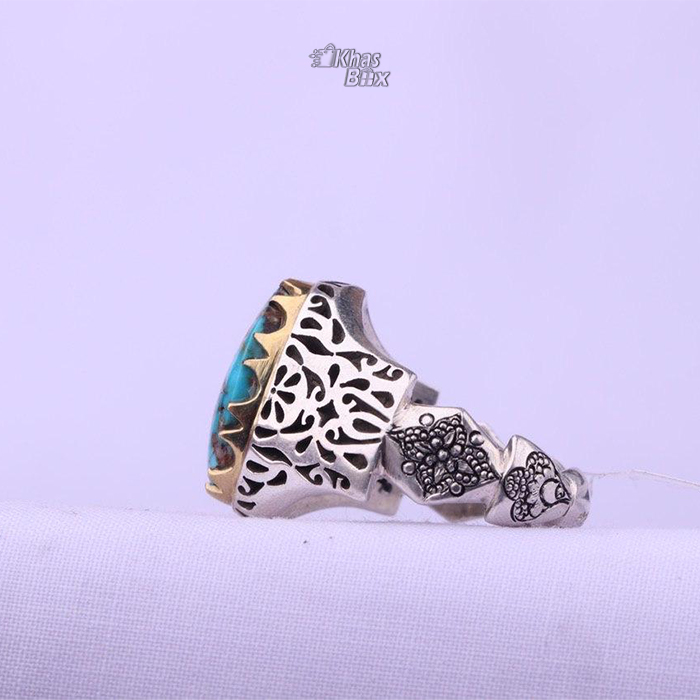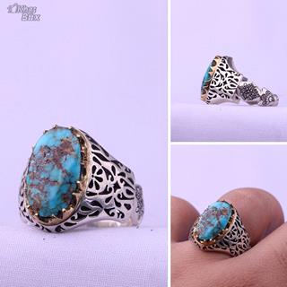انگشتر فیروزه نیشابور اصل رکاب دستساز استاد محمد پور قلمزنی دستی وزن ۱۶/۵ گرم