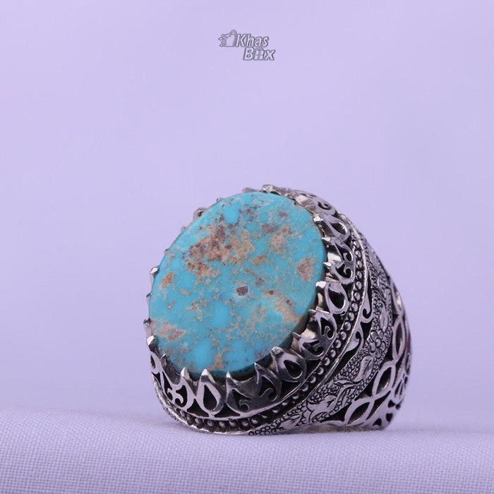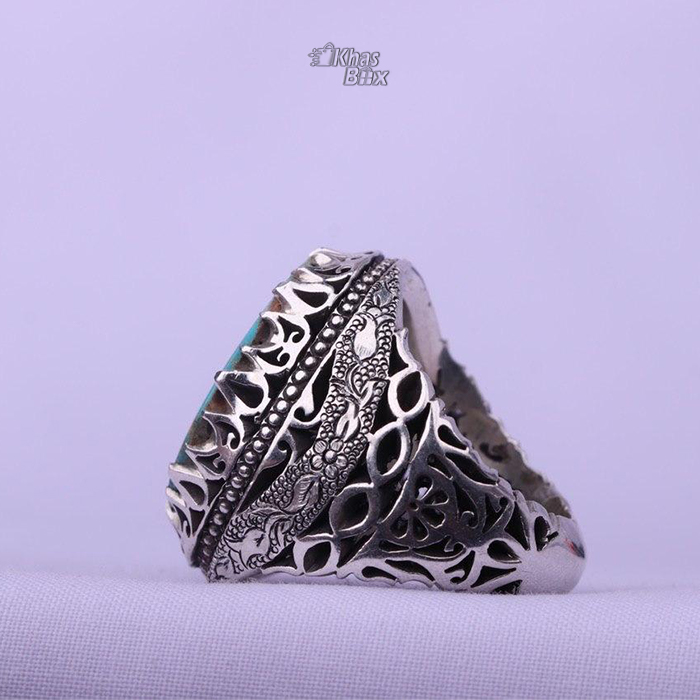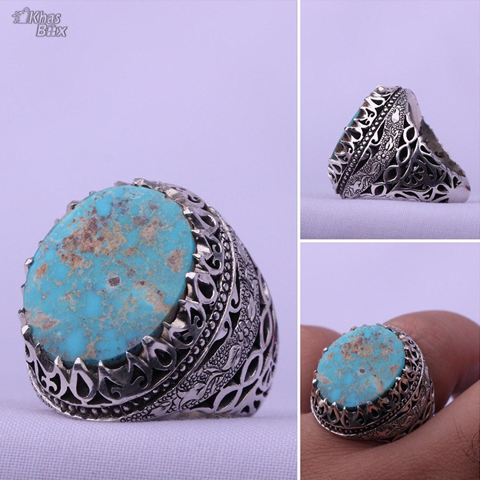 انگشتر فیروزه نیشابور رکاب دستساز استاد محمد پور قلمزنی زیبا وزن ۲۹/۹ گرم