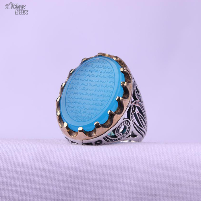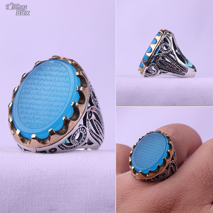 انگشتر عقیق آبی خطی نقش حرز امام رضا وزن ۱۷/۱۲ گرم