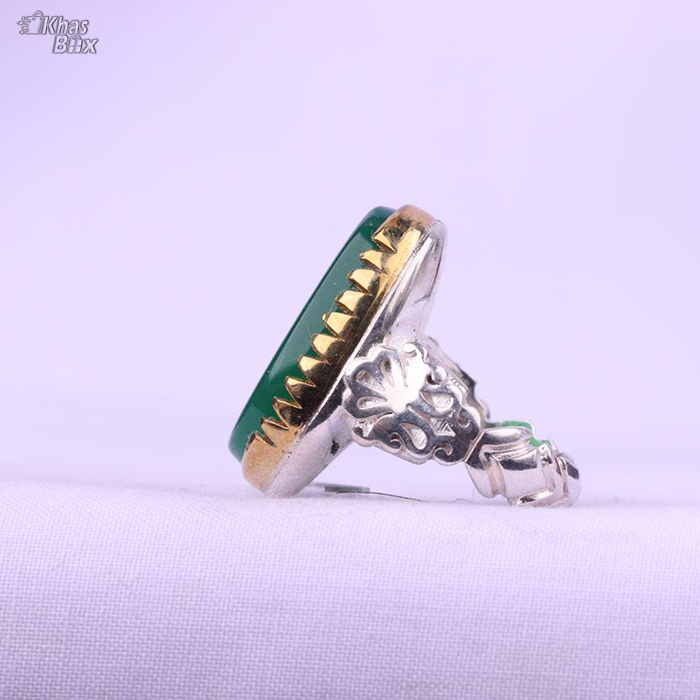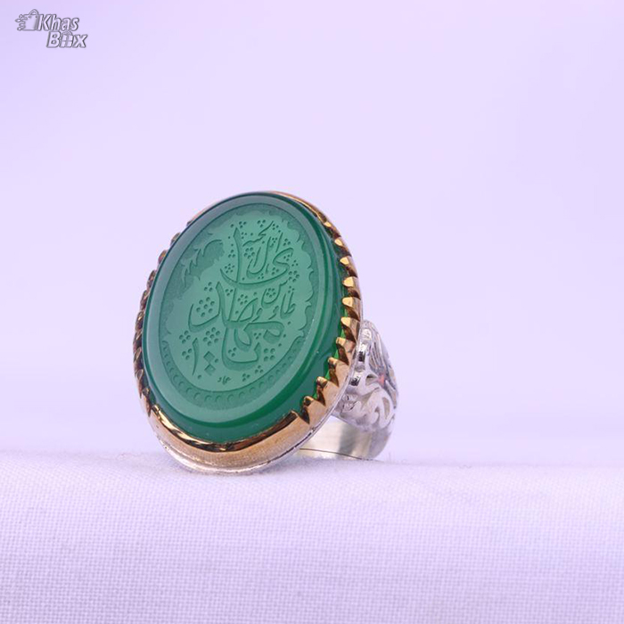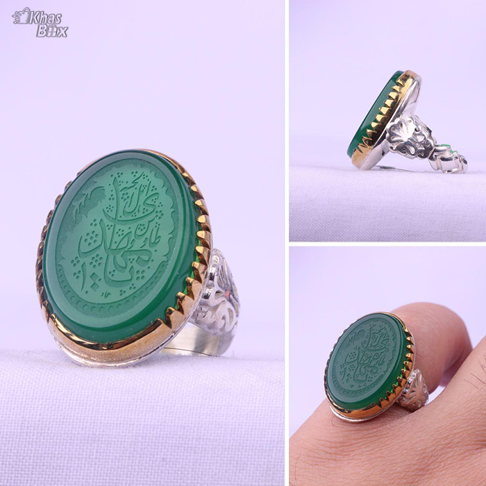 انگشتر عقیق سبز خطی نقش المهدی طاووس اهل الجنه وزن ۱۵/۷۳ گرم