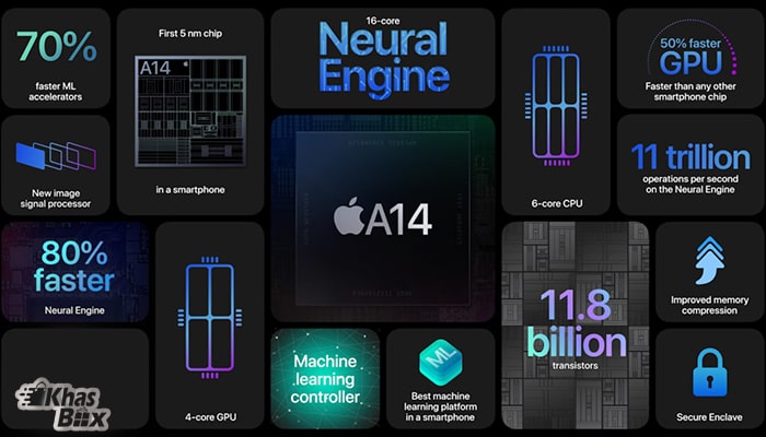 تراشه Apple A14 Bionic تمام سری آیفون 12 را پوشش می دهد. این اولین چیپست 5 نانومتری تجاری موجود در جهان است که 11.8 میلیارد ترانزیستور عظیم را در خود جای داده است که 40٪ بیشتر از A13 است.