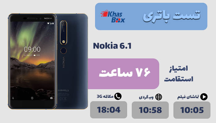 امتیاز 76 ساعت شامل همهی سناریوهای تست شده روی باتری اورجینال نوکیا 6.1 است. این سناریوها شامل حالت آماده به کار گوشی، تماشای فیلم، وبگردی و تماس است. در هریک از این بخشهای جداگانه هم این باتری نتایج خوب یرا کسب کند. به عنوان مثال در بخش تماس این باتری 18 ساعت و 4 دقیقه بازدهی دارد. در بخش وب گردی این مدت زمان به چیزی حدود 11 ساعت میرسد و در بخش تماشای فیلم هم نتیجهی 10 ساعته برای این باتری کسب شده است.