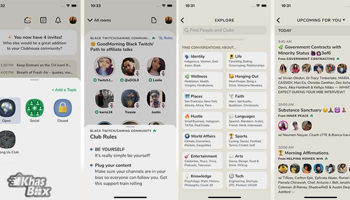 ویژگی اصلی Clubhouse "اتاق" های مجازی یا همان چت رومهای معروف خودمان است که در آن کاربران میتوانند از طریق صدا با یکدیگر ارتباط برقرار کنند. مسلماً مهمتر از پیگیری شخص خاصی، پیگیری باشگاهها و موضوعات مهم است. کلاب هاوس دارای مباحث گستردهای برای جستجوی در گروههای مختلف است. پس از وارد شدن به برنامه شما به راحتی میتوانید وارد اتاقهای گفت و گو شوید. به عنوان مثال میتوانید برای موسیقی، فیلم و بازی وارد روم خاصی شوید و یا مکالمات پیرامون تندرستی، فناوری، روابط و دهها مورد دیگر را برای شایعات، مشاوره ها و گفتمانهای احتمالی بالقوه دنبال کنید.