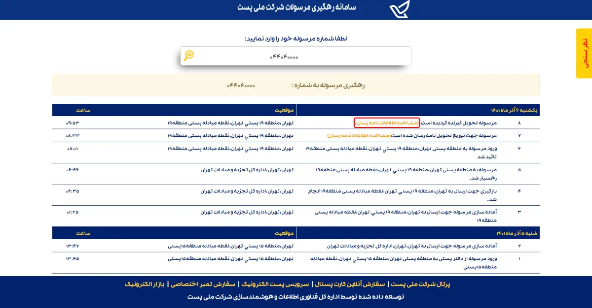 در صفحه جدید وضعیت بسته شما نشان داده می شود.